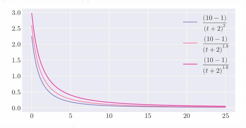 不难看出, G 值越大,曲线越陡峭,排名下降的速度越快,意味着排行榜的更新速度越快。