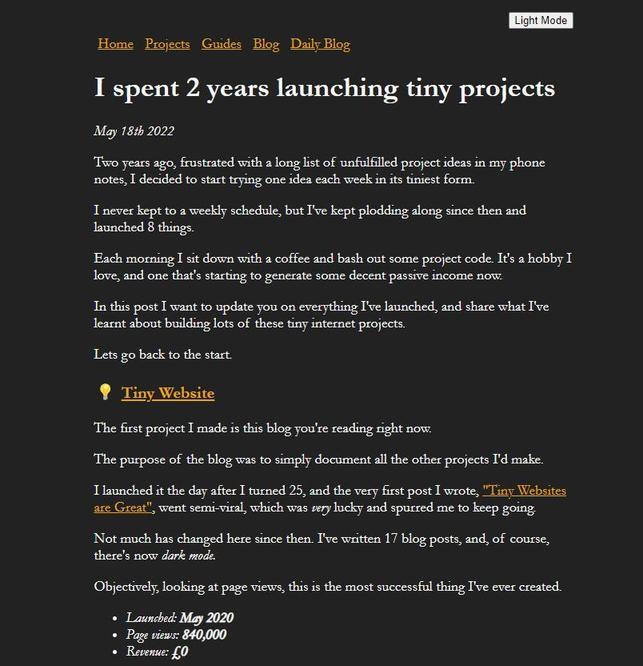 作者介绍自己两年间落地八个想法,其中部分项目持续盈利,特别是分享了自己在构建这些小型互联网项目方面所学到的知识以及成果。