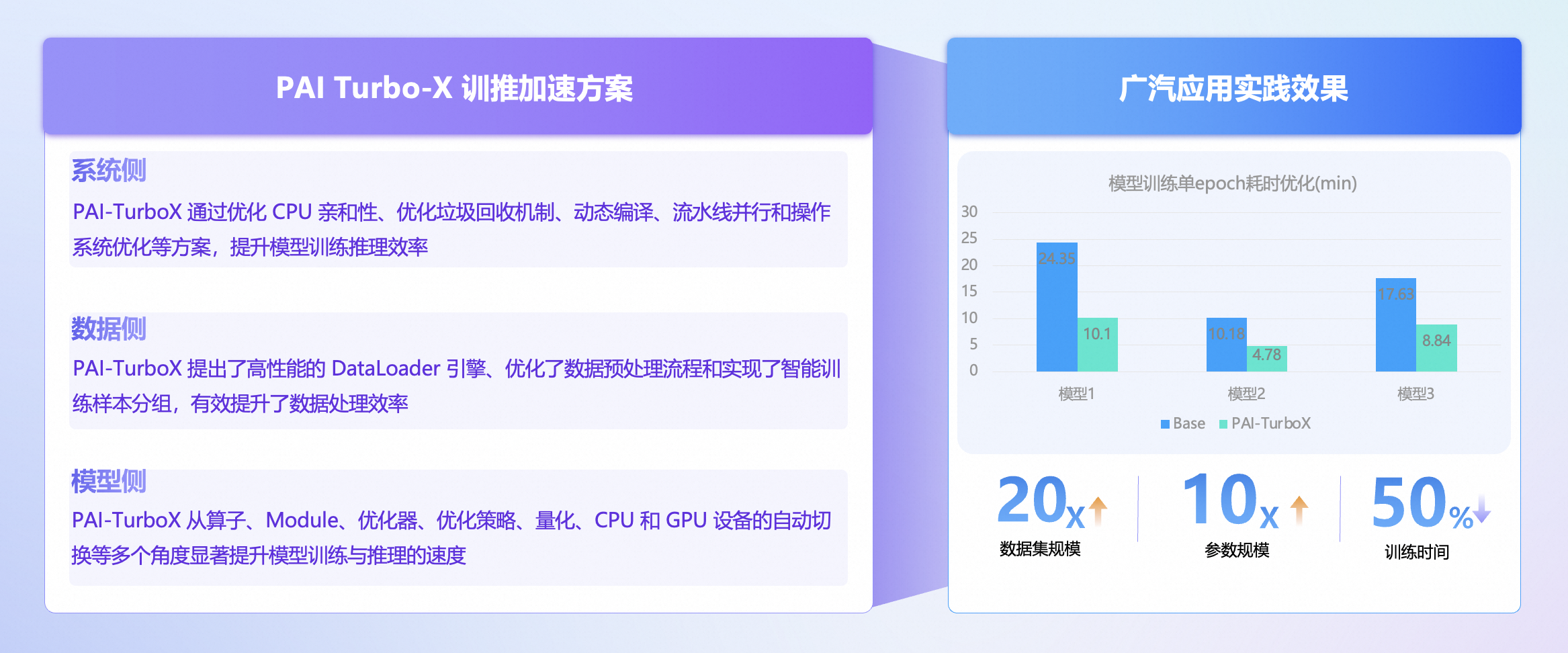 值得高兴的是,广汽在模型训练效率上,成功应用了 PAI Turbo-X 的模型训练加速方案,在系统侧,数据侧,模型侧等多维度全方位加速: