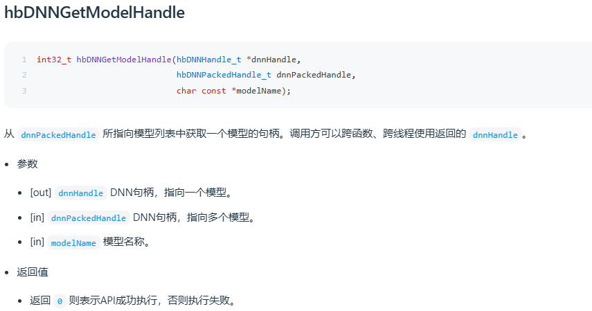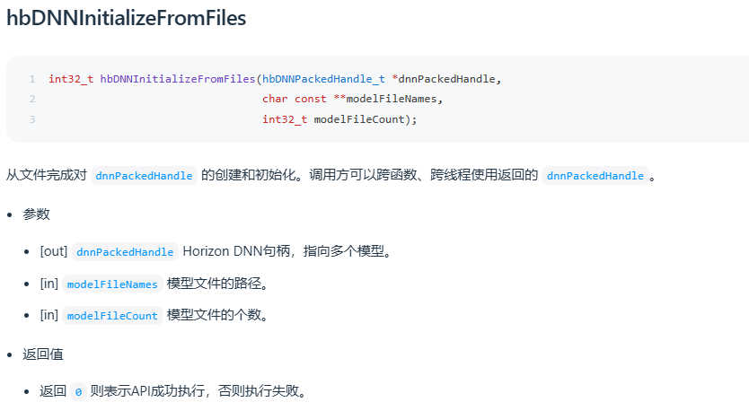 在工具链用户手册《统一计算平台 UCP - 模型推理开发 - 模型推理 API 手册 - 功能接口》中,详细介绍了加载打包模型 hbDNNInitializeFromFiles 与 获取单个模型句柄 hbDNNGetModelHandle 的使用方式,截图如下: