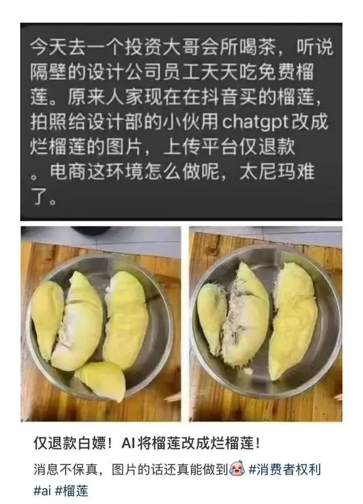 “趣解商业”注意到,如今有一些消费者会用 AI 生成的产品图片如发霉榴莲、破损的化妆品去找商家骗退款。其实类似的骗术早就出现过,但当时修图工具使用门槛较高,商家遇到假图往往能识别出来;如今 AI 工具成熟,商家辨别难度增大,无形中也增加了与消费者之间的信任危机。
