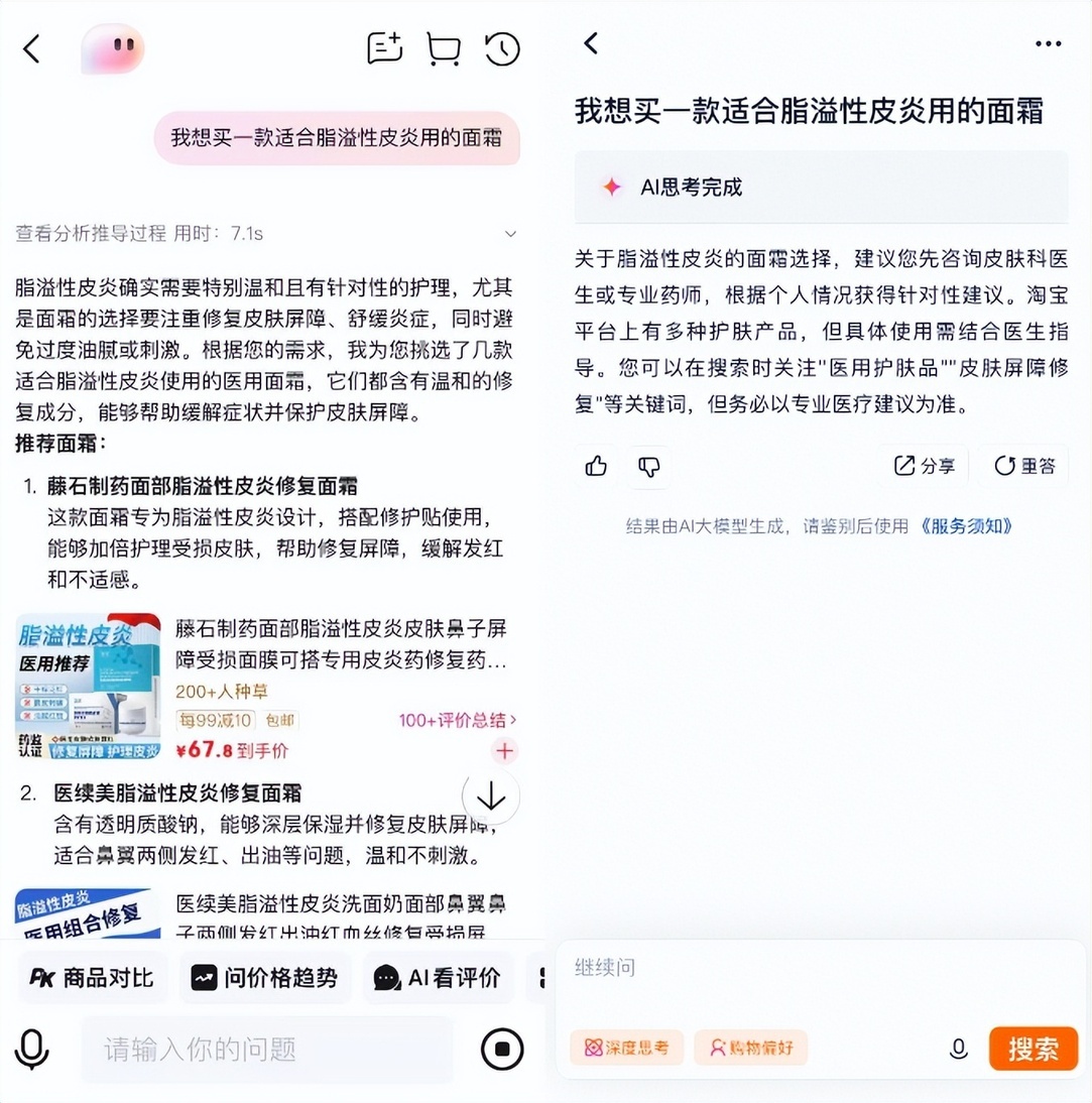 “趣解商业”注意到,这些导购应用中淘宝主推的是“AI 万能搜”,将其直接放置在了一级入口,点进搜索框即可看到。体验后可以发现,淘宝的万能搜主打解决用户的一些复杂需求,多轮对话后推荐商品的同时会附上具体链接;对于一些专业程度较高的问题,万能搜的回答也相对谨慎,不会盲目推荐产品。