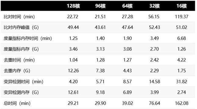 使用本文流程对鸡全基因组测序数据进行变异检测分析,下表为不同 CPU 核数下的计算时间和资源调用情况: