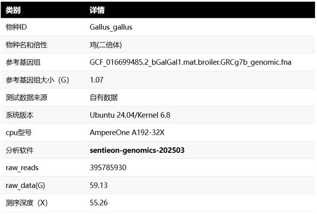 测试鸡样本测序深度 55.26X,从 FASTQ 到 VCF 全流程分析最快用时 29.21 分钟,大幅缩短了鸡的全基因组 WGS 分析时间,有效加快畜禽的分子育种进程。