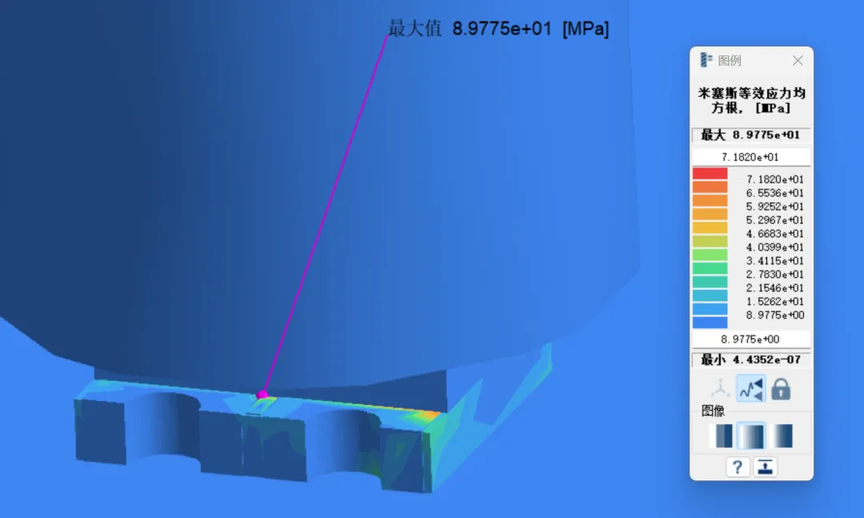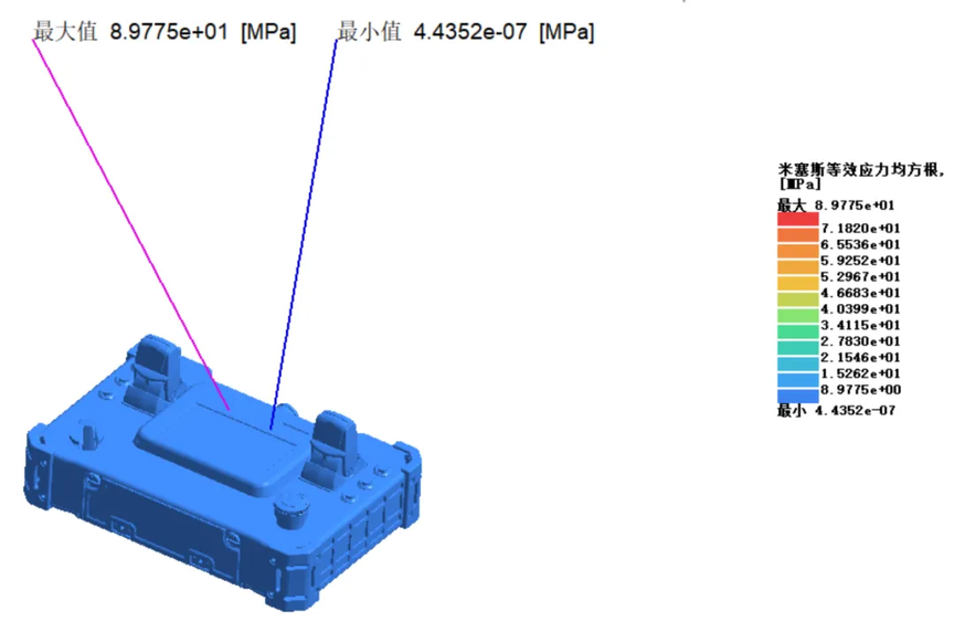 点击求解,大约 10s 完成计算,查看米塞斯应力均方根值,通过极值显示可以定位到需关注的高应力区,可据此进一步评估结构的应力可靠性和疲劳性能。同样的方法,可以得到其他方向随机振动仿真结果。