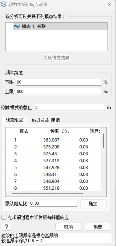 添加动力学分析-随机振动分析,关联模态分析结果,频率范围选择 20-800Hz,阻尼比 0.03,其他默认设置。