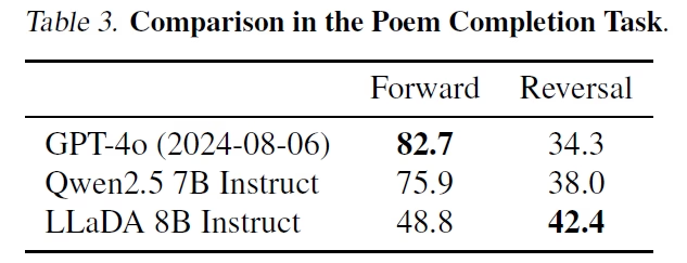 性能测试显示,8B 参数的 LLaDA 基础模型明显优于同等规模的 LLaMA 2,并与 LLaMA 3 表现相当。更令人惊喜的是,LLaDA 在逆向推理任务中表现出色,有效解决了自回归模型在“逆向诅咒”上的局限性,甚至在诗歌逆向补全任务中超越了 GPT-4o 和 Qwen 2.5。
