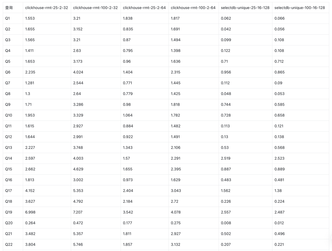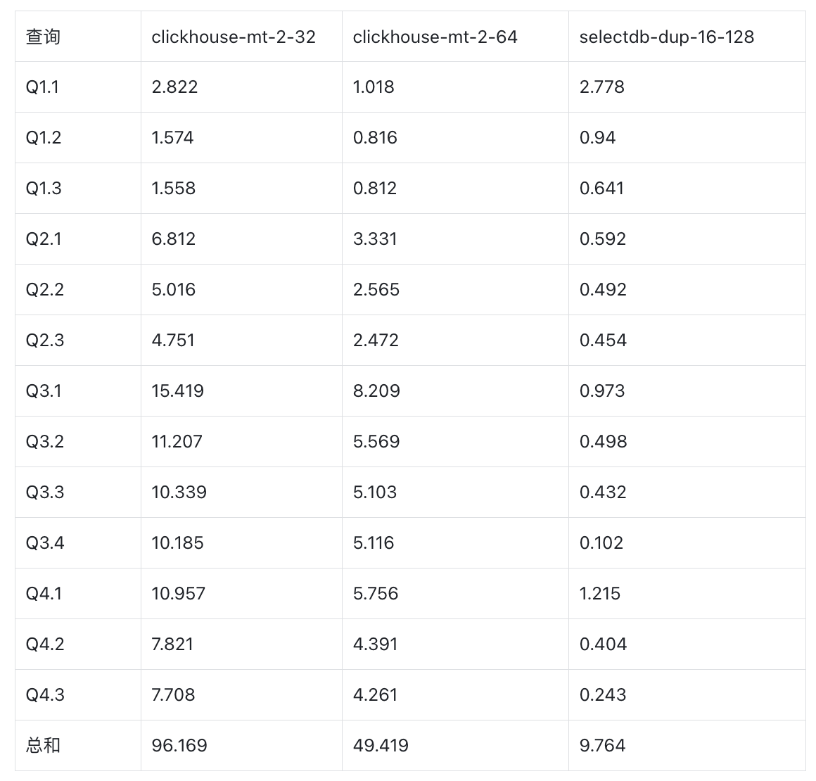 SelectDB (16c 128GB)的性能是 ClickHouse 16c 64GB(2 replica 每个 replica 16c 64GB)的 9.8 倍。