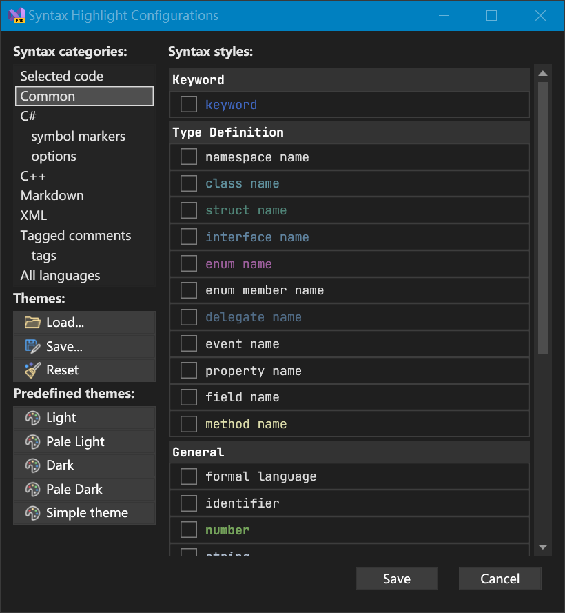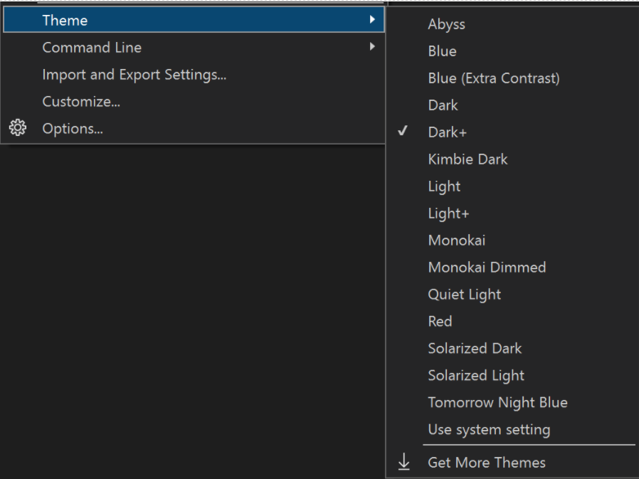 基于默认 VS Code 主题的主题包,使用主题转换器创建。这些主题与 Visual Studio 2022 Preview 4 及更高版本最兼容(支持的主题包括:Abyss、Dark+、Kimbie Dark、Light+、Monokai、Monokai Dimmed、Quiet Light、Red、Solarized Dark、Solarized Light、Tomorrow Night Blue)。
