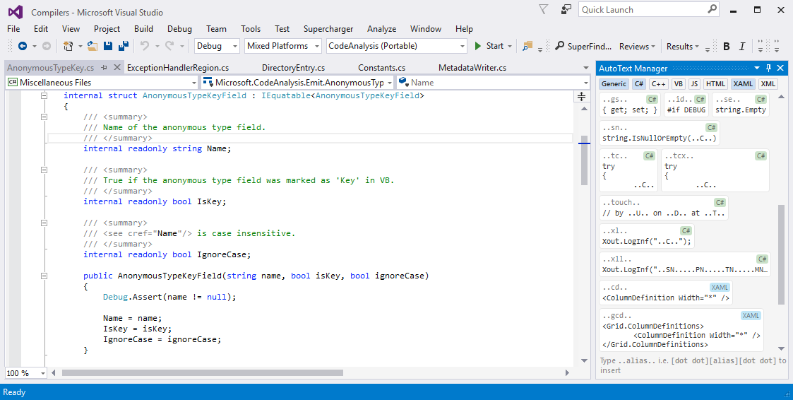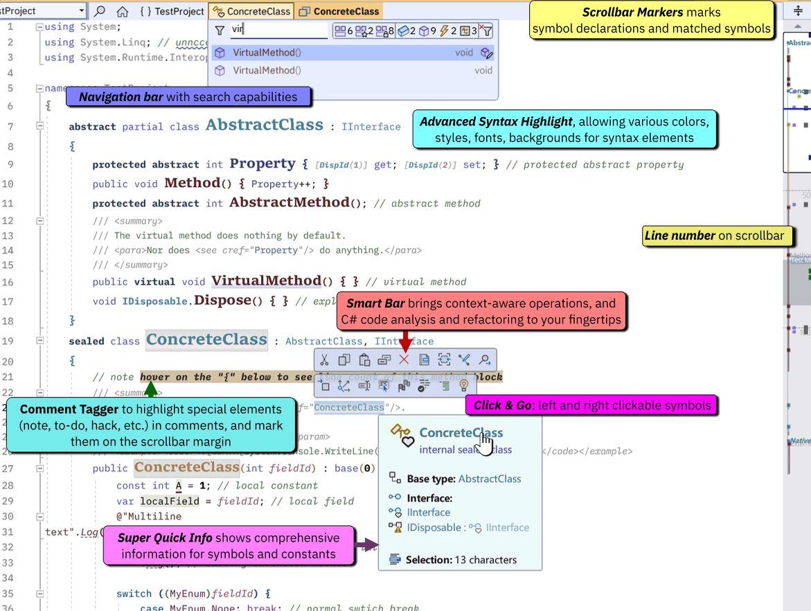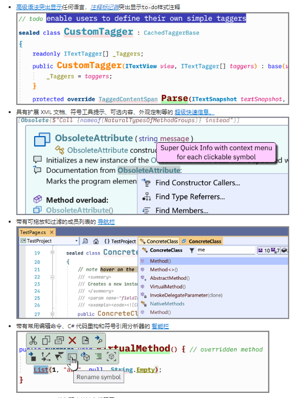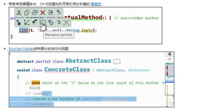 致力于为 C# 程序员提供更佳的编码体验和效率的 Visual Studio 扩展,增强了语法高亮、快速信息(工具提示)、导航栏、滚动条、显示质量,并带来了自动更新的版本号、智能工具栏与高级编辑、代码分析和重构命令等。