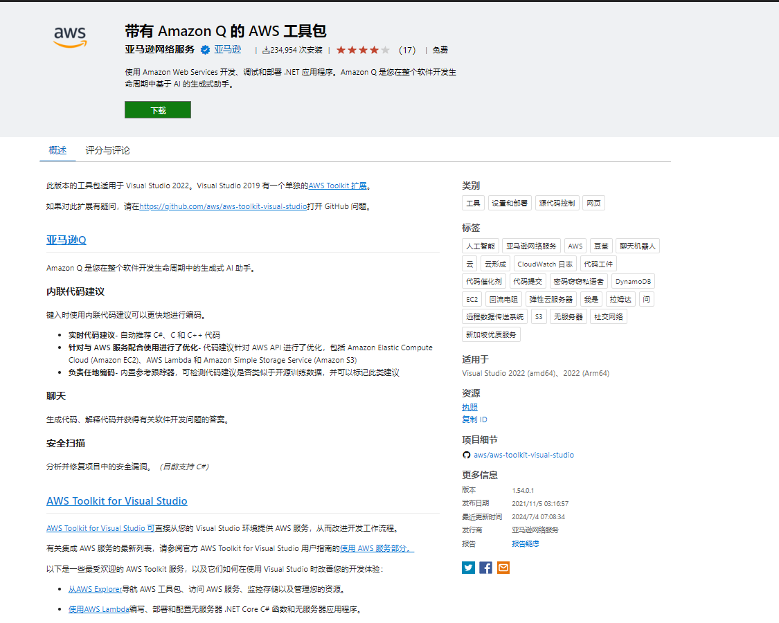 插件市场地址:https://marketplace.visualstudio.com/items?itemName=AmazonWebServices.AWSToolkitforVisualStudio2022