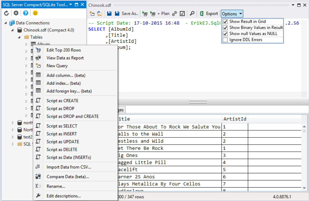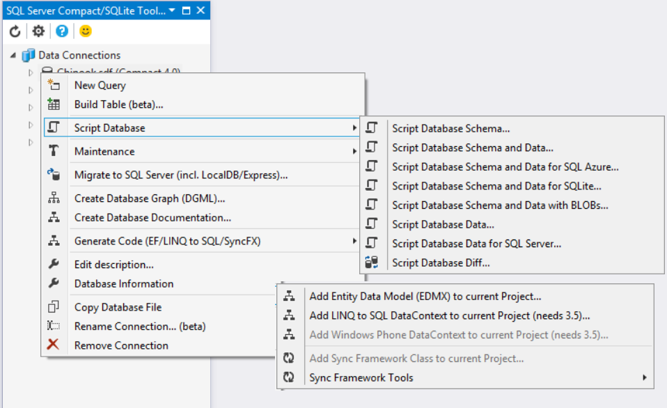 适用于 Visual Studio 的 SQLite / SQL Server Compact 工具箱扩展。此扩展添加了多项功能来帮助您的嵌入式数据库开发工作:表和数据的脚本编写、从 SQL Server 和 CSV 文件导入等等。