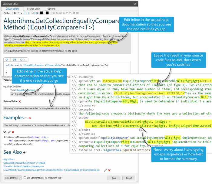 GhostDoc 是一个 Visual Studio 扩展,适用于需要使用可自定义模板从源代码生成 XML 注释、维护干净且最新的文档、生成多种格式的帮助文档、使用 Visual Studio 中的智能源代码拼写检查器等的开发人员。