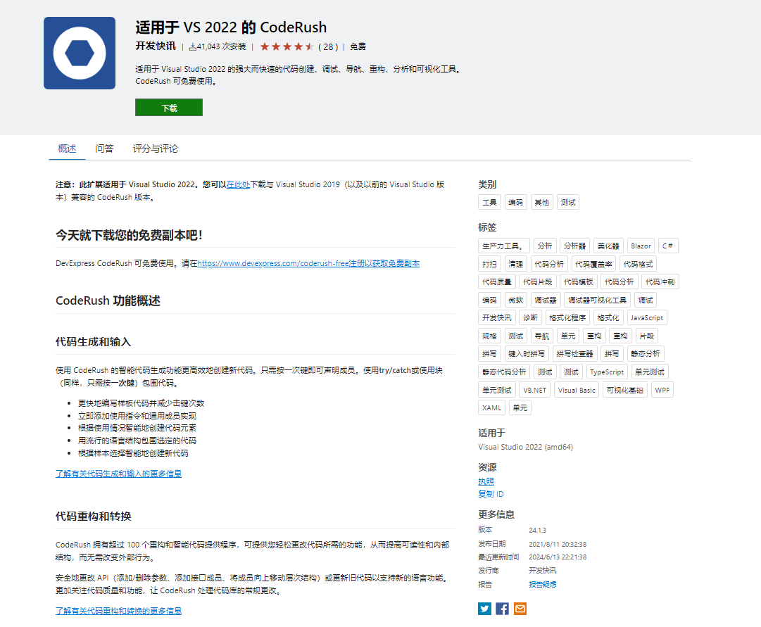 插件市场地址:https://marketplace.visualstudio.com/items?itemName=DevExpress.CodeRushforVS2022
