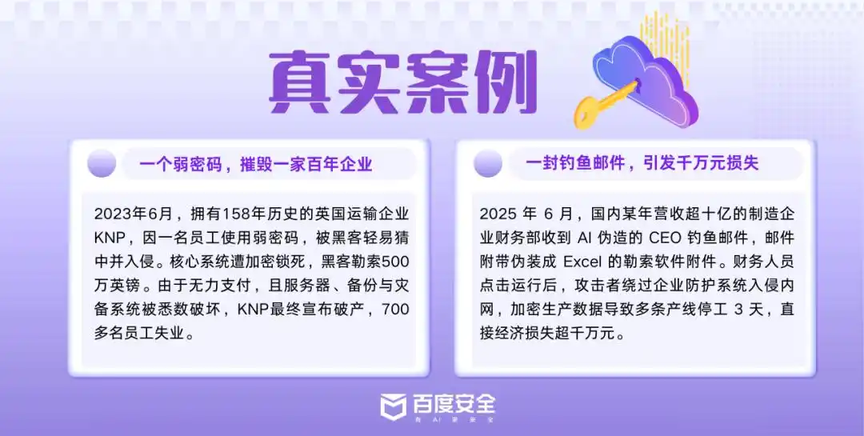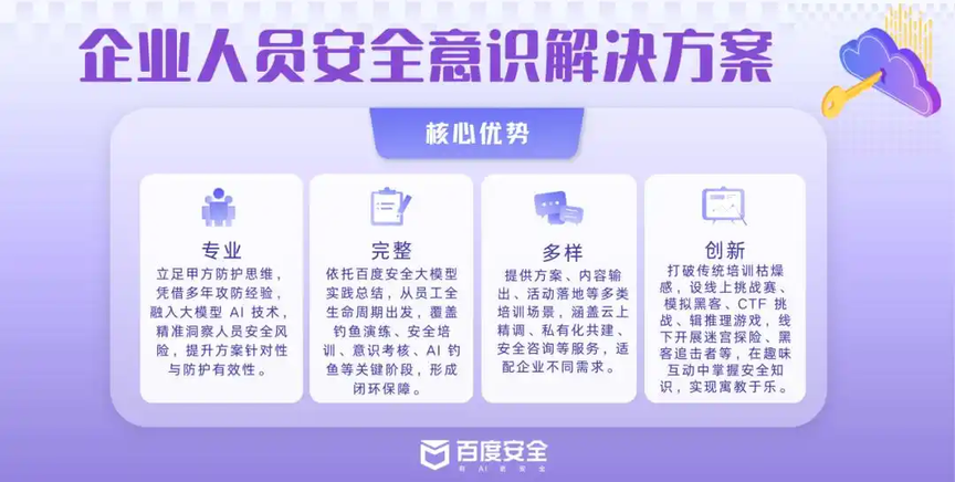 百度安全愿与各企业携手,将安全意识内化为每位员工的自觉行动,共同将“人”这一最关键的变量,转化为企业安全防御中最坚固的基石。