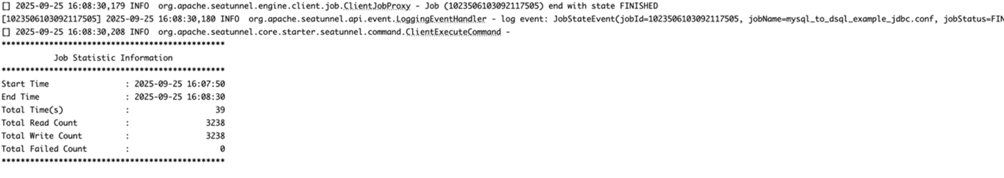 将上面的配置保存为 mysql-to-dsql.conf 文件(请注意需要将示例中的值替换为真实的参数),存放在 apache-seatunnel-${version} 的 config 目录下,执行以下命令: