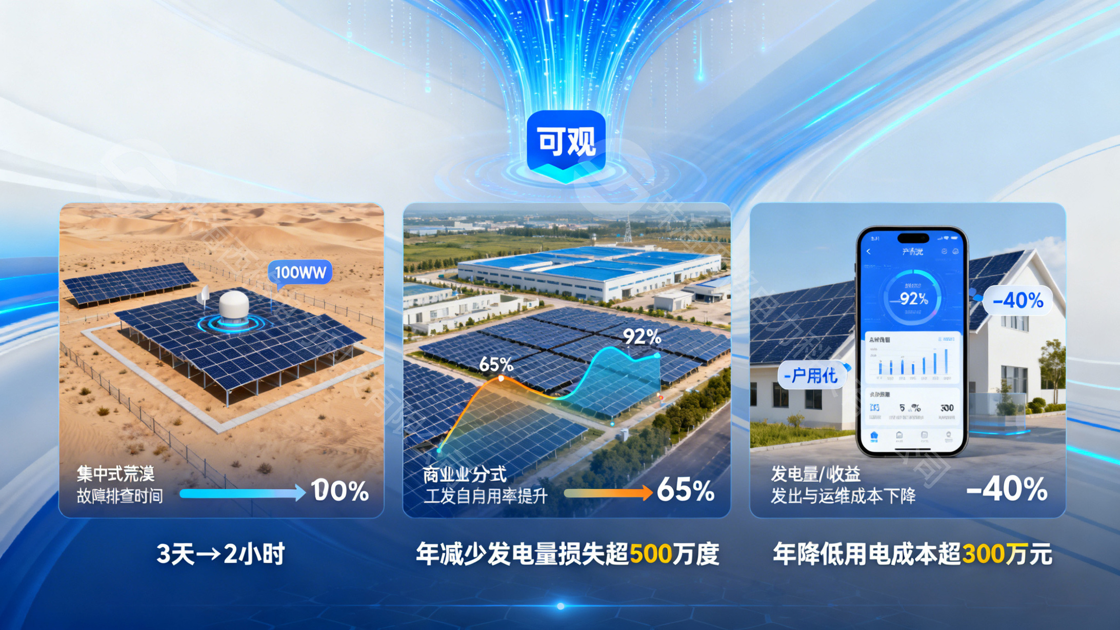在工商业分布式电站中,某工业园区光伏项目通过“可观”功能的实时数据监测与负荷匹配分析,将自发自用率从 65%提升至 92%,年降低用电成本超 300 万元;