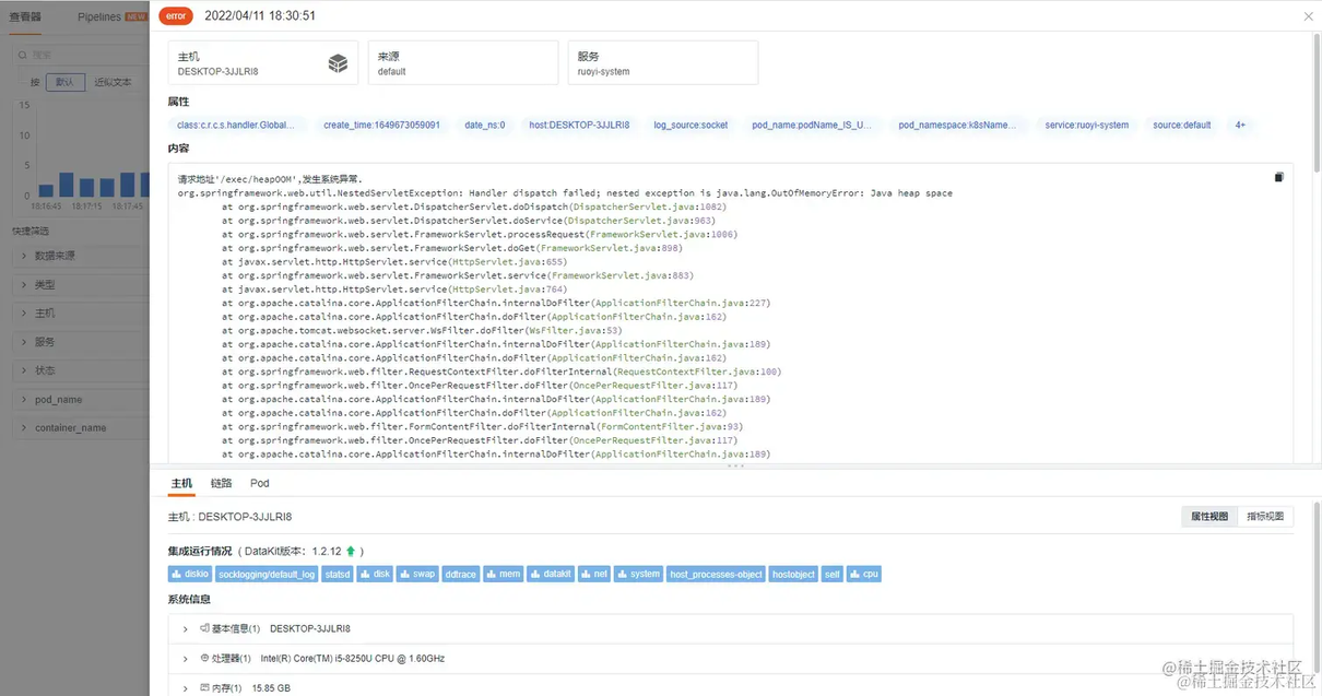 浏览器请求 http://localhost:9201/exec/heapOOM, 需要等一段时间才能看到异常输出。看到异常输出后,即可前往观测云查看对应的日志。