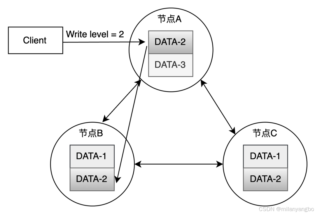 2)W (Write Quorum):写一致性级别(Write Consistency Level),表示一个写操作需要成功更新至少 W 个副本后,才能被确认为成功。从图中可以看到,DATA-2 的写副本数为 2,也就说,对 DATA-2 执行写操作时,完成了 2 个副本的更新(比如节点 A、C),才完成写操作。
