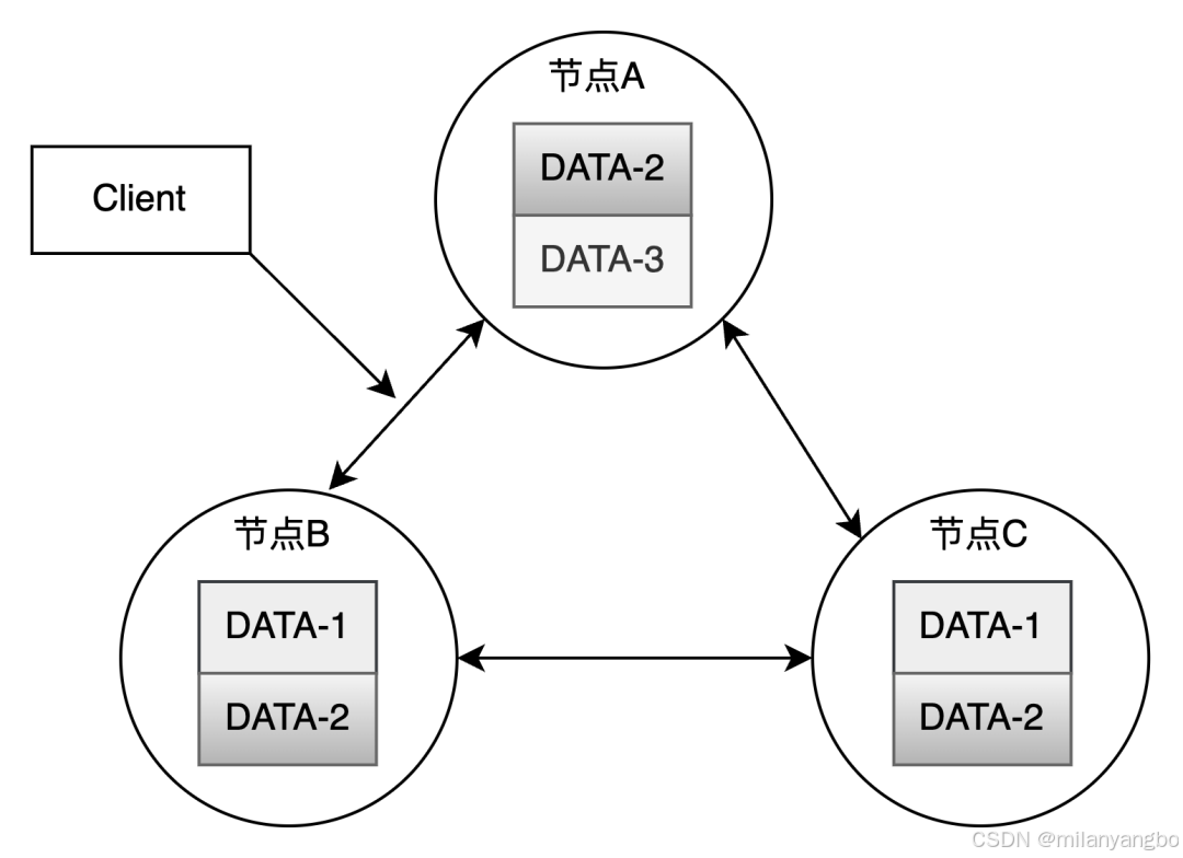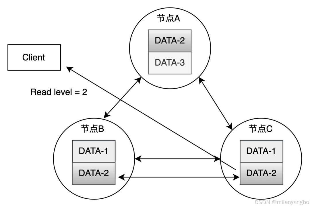 3)R (Read Quorum):读一致性级别(Read Consistency Level),表示一个读操作需要从至少 R 个副本中读取数据后,才能综合结果并返回给客户端。从图中可以看到,DATA-2 的读副本数为 2。也就是说,客户端读取 DATA-2 的数据时,需要读取 2 个副本中的数据,然后返回最新的那份数据。