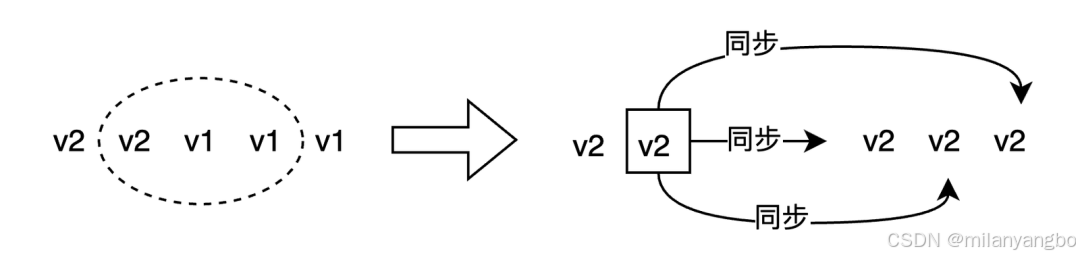 若中心节点与其中三个副本通信成功,读取到的版本号为(v1 v1 v1),则任选一个副本作为 Leader,新 Leader 以 v1 作为最新的成功提交的版本并与其他副本同步,当与第 1、第 2 个副本同步数据时,由于第 1、第 2 个副本版本号大于 Leader,属于脏数据。对于脏数据可以简单直接丢弃,也可以基于 undo 日志方式进行回滚。新 Leader 也有可能与后两个副本完成同步后就提供数据服务,随后自身版本号也更新到 v2,如果系统不能保证之后的 v2 与之前的 v2 完全一样,则新 Leader 在与第 1、2 个副本同步数据时不但要比较数据版本号还需要比较更新操作的具体内容是否一样。