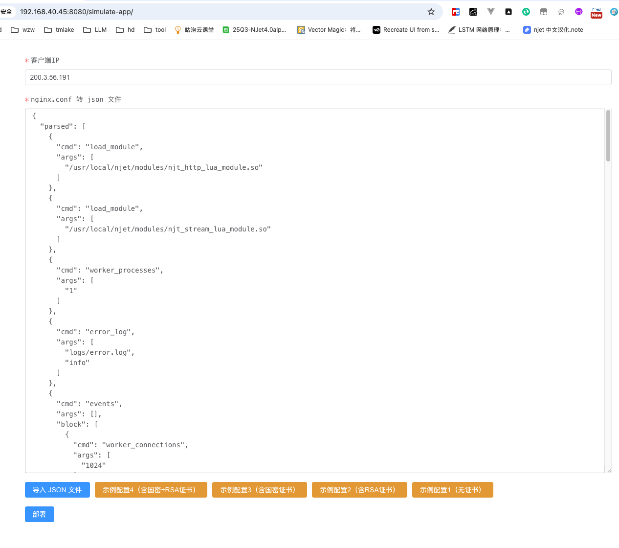 功能模拟依赖于导入配置文件,目前配置文件需要使用 json 格式,目前需要手工把 nginx 格式的配置文件转换为 json,paste 或上传,在下个版本中,将直接支持 nginx.conf 格式的配置