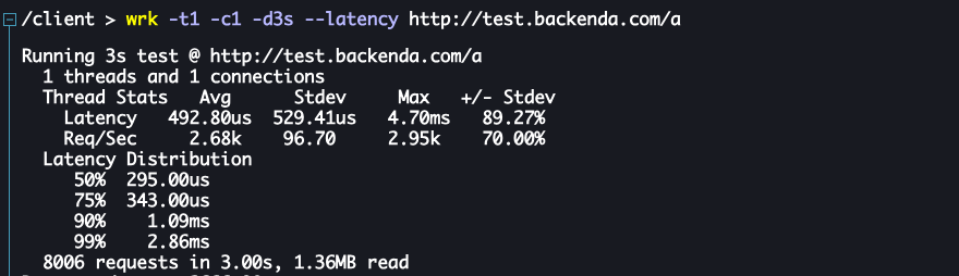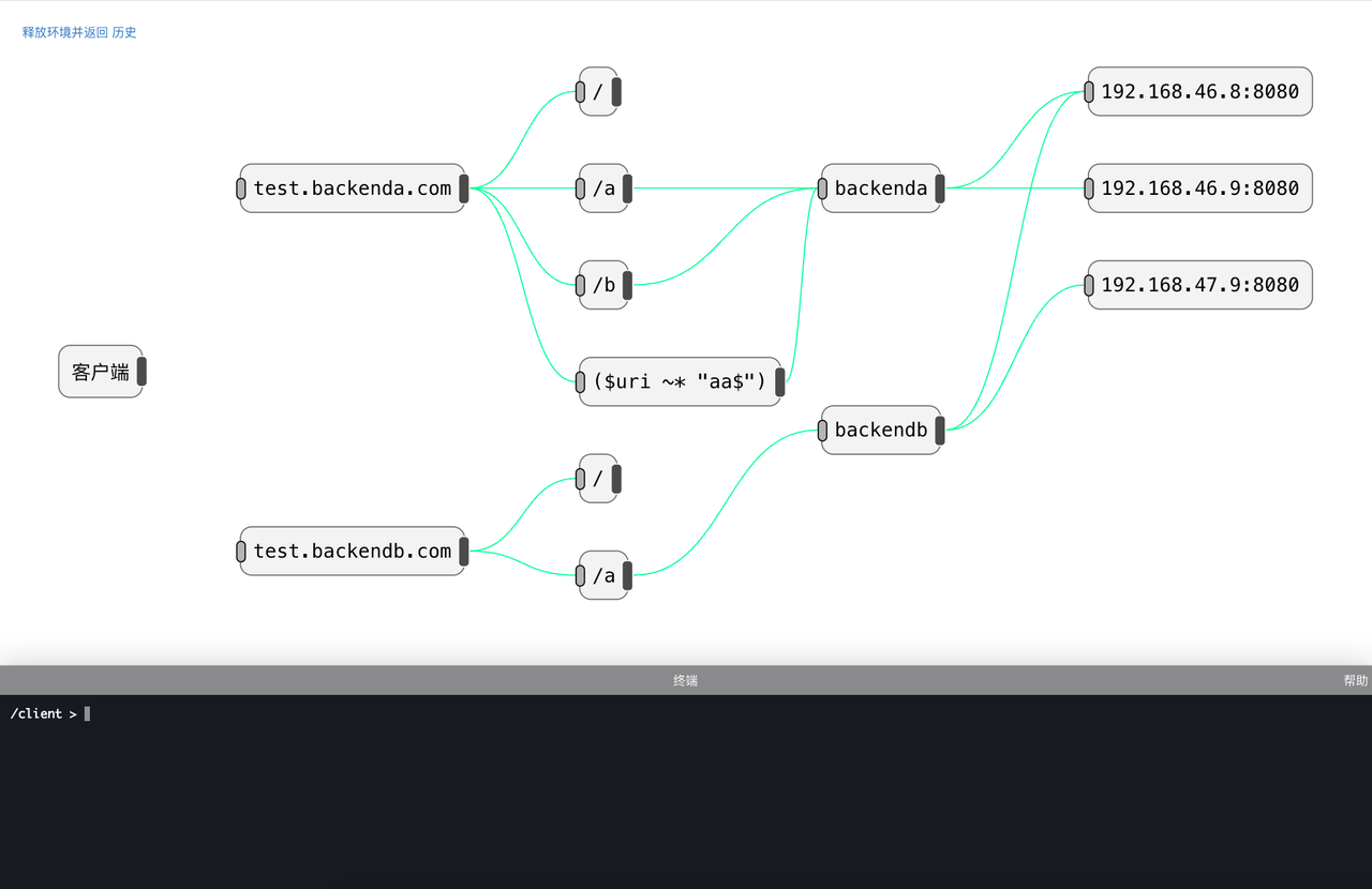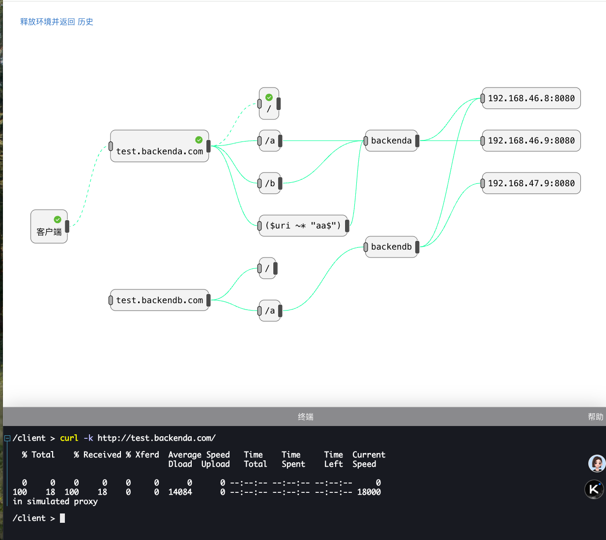 在模拟环境中,下侧为 web terminal,可以输入特定的命令,单条或批量发送 HTTP 请求,验证配置的正确性。目前内置了 curl 和 wrk 命令,前者进行单条的功能测试,后者进行批量的测试