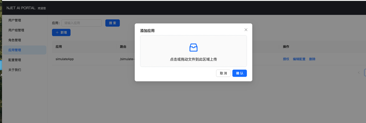 在 portal 上添加 “Portal 版 NJet 模拟环境应用, 目前发布的模拟应用包为 simulate-app_1.0.2.npk,请从 NJet 的 release 站点下载