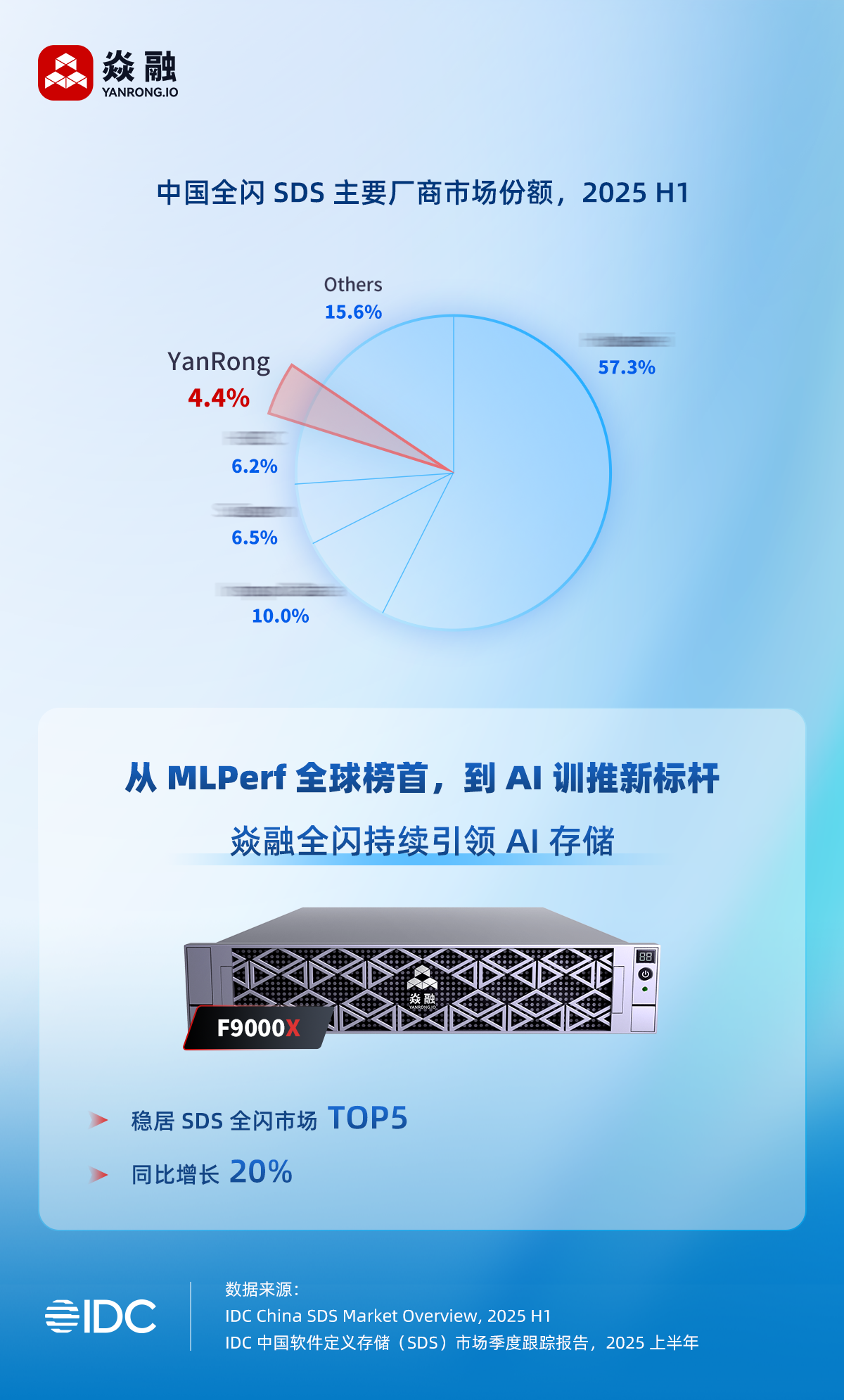 在 AI 时代的浪潮下,企业对高性能存储的需求持续攀升,全闪存储已成为支持 AI 工作负载的首选方案。IDC 报告指出,2025 年上半年,全闪 SDS 仍然是增长最快的市场,而焱融全闪以 20% 的增速稳居市场 TOP5,充分体现了其在 AI 场景中的市场认可度。