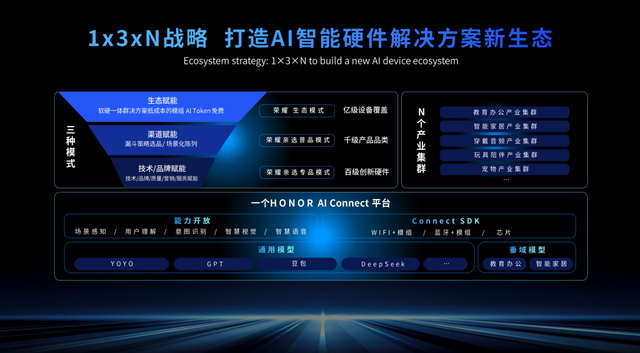 其中,“1”代表 HONOR AI Connect 平台,可将荣耀的 AI 能力开放给所有的生态合作伙伴;“3”代表通过“生态赋能”“渠道赋能”以及“技术与品牌赋能”三种模式扶持合作伙伴;N 代表荣耀将覆盖教育办公、智能家居、音频穿戴、玩具陪伴、宠物等 N 个产业集群。