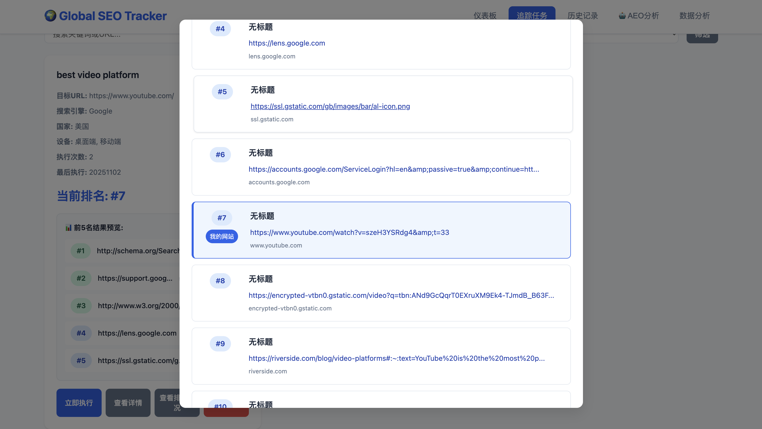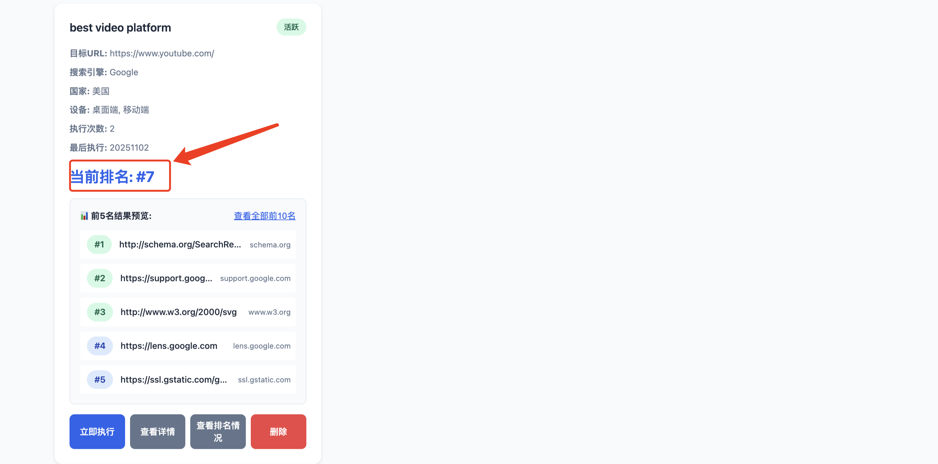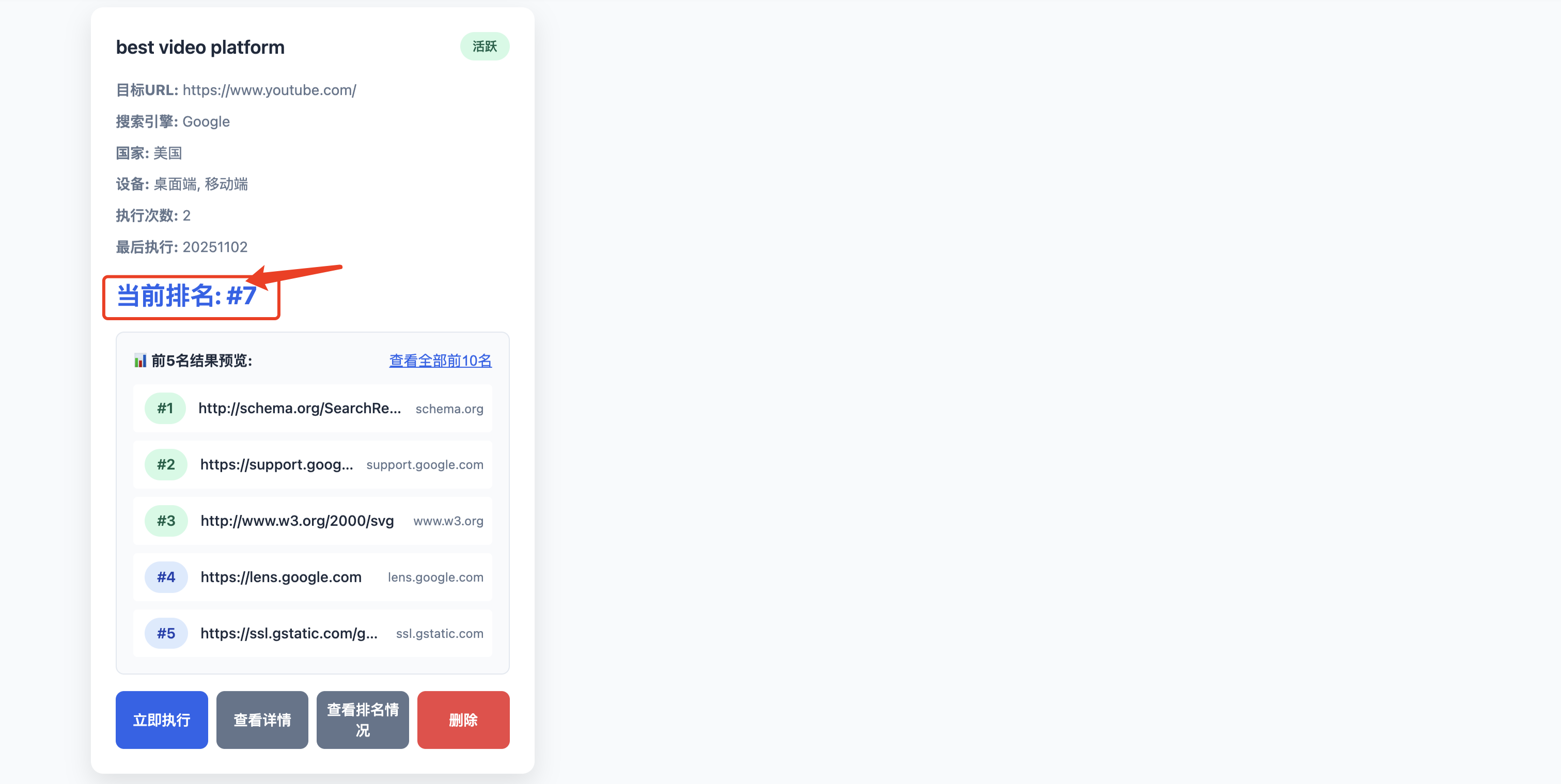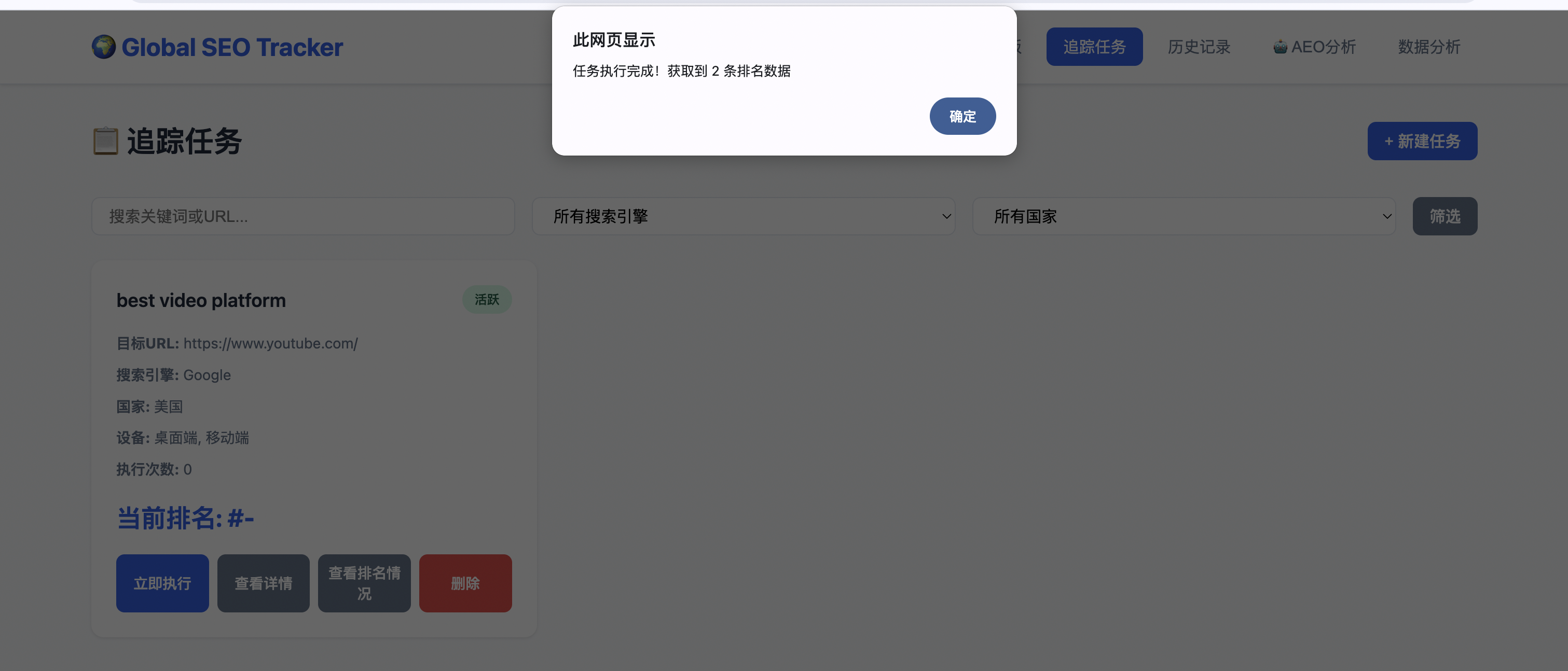 点击“立即执行”之后,获取到排名结果,任务执行完成之后会有下面提示