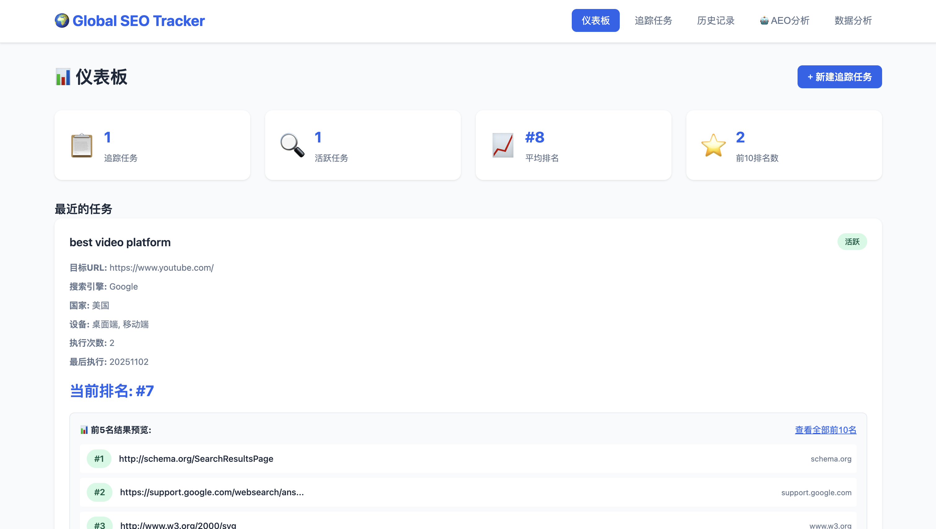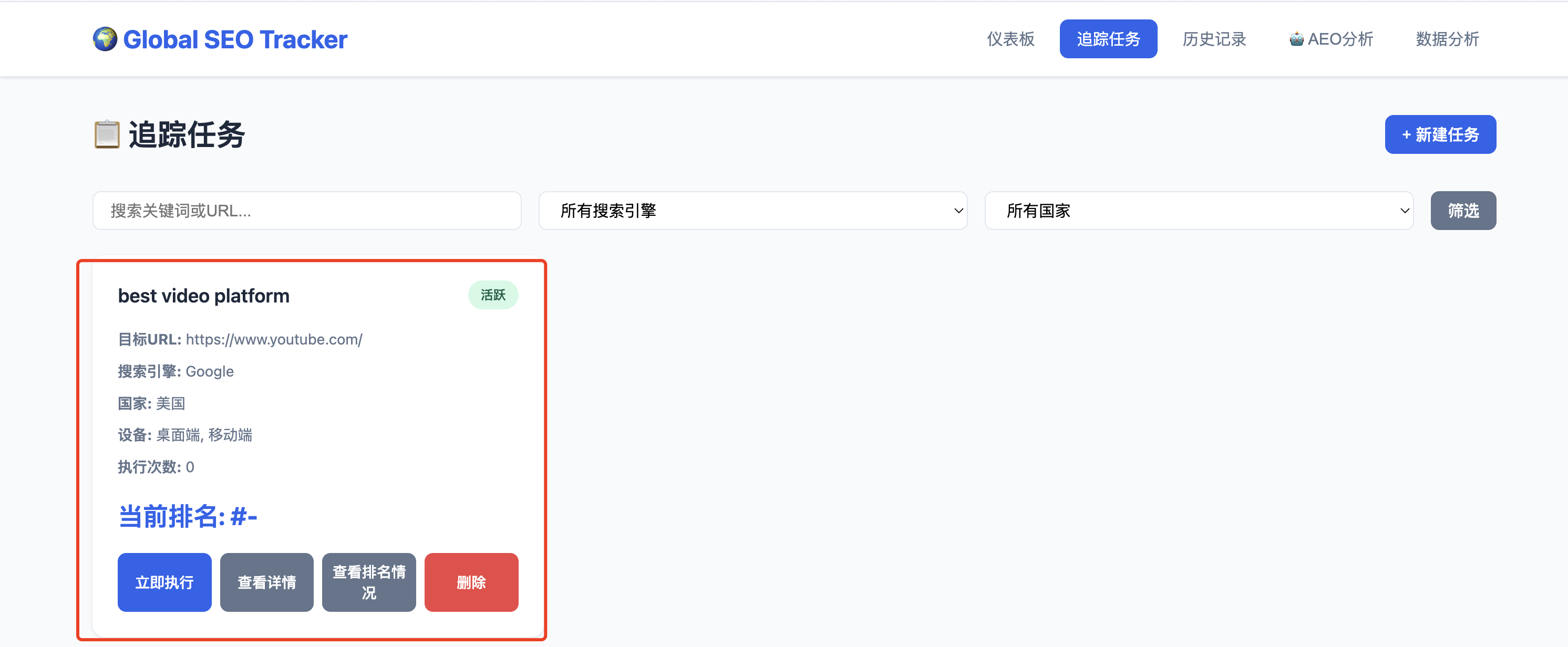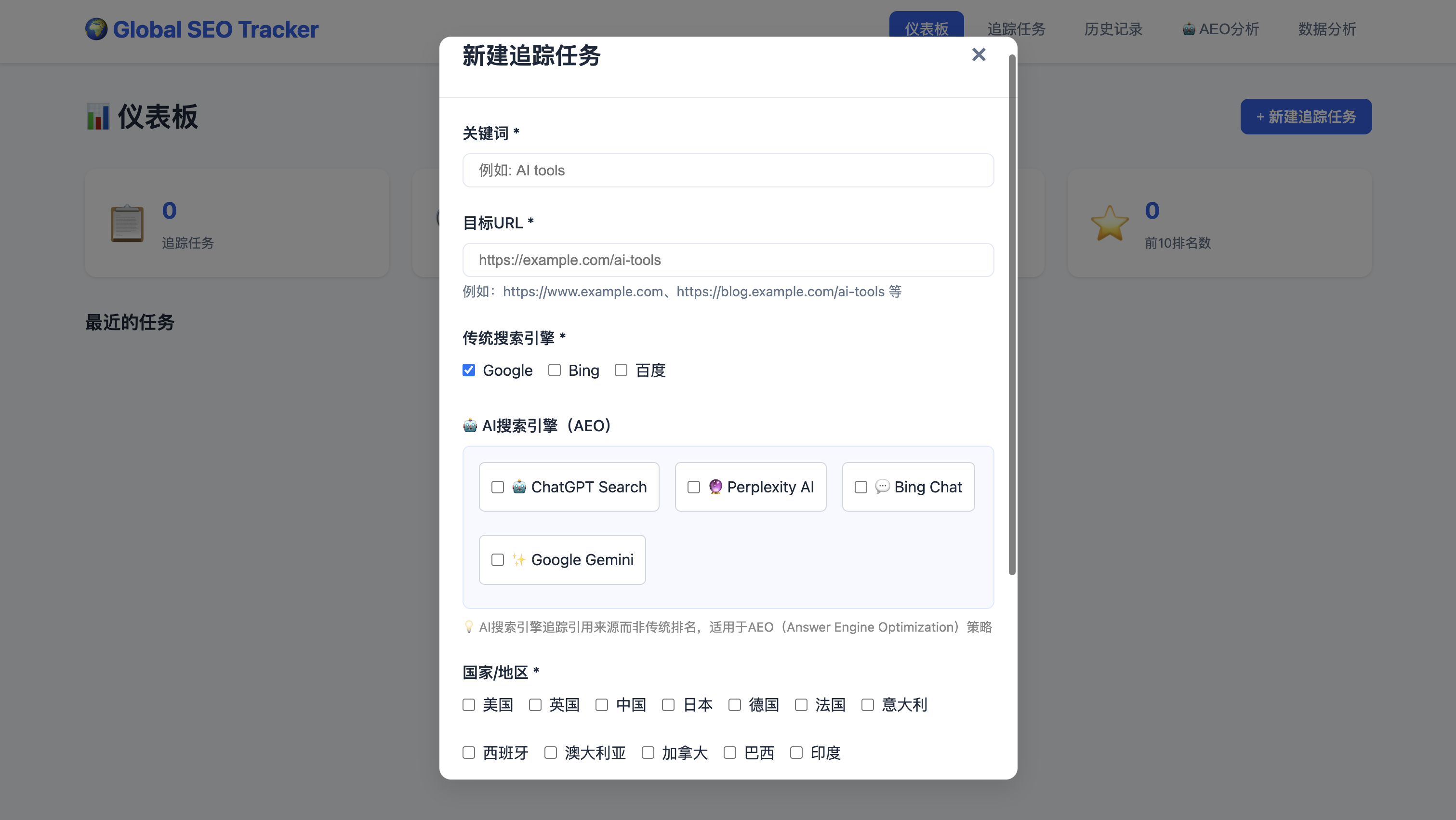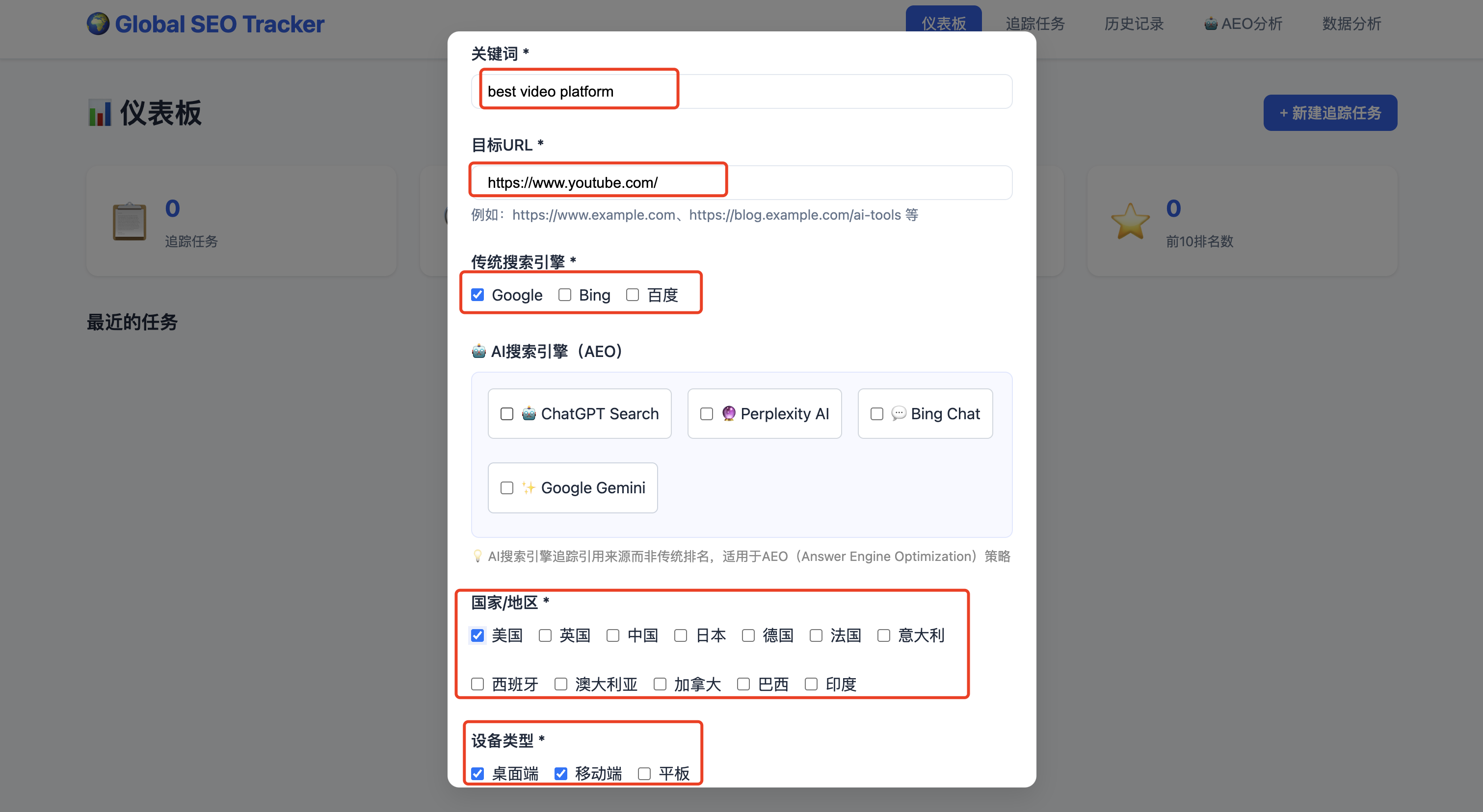 新建追踪任务,设置关键字、目标 URL、搜索引擎、地区、设备类型、追踪频率