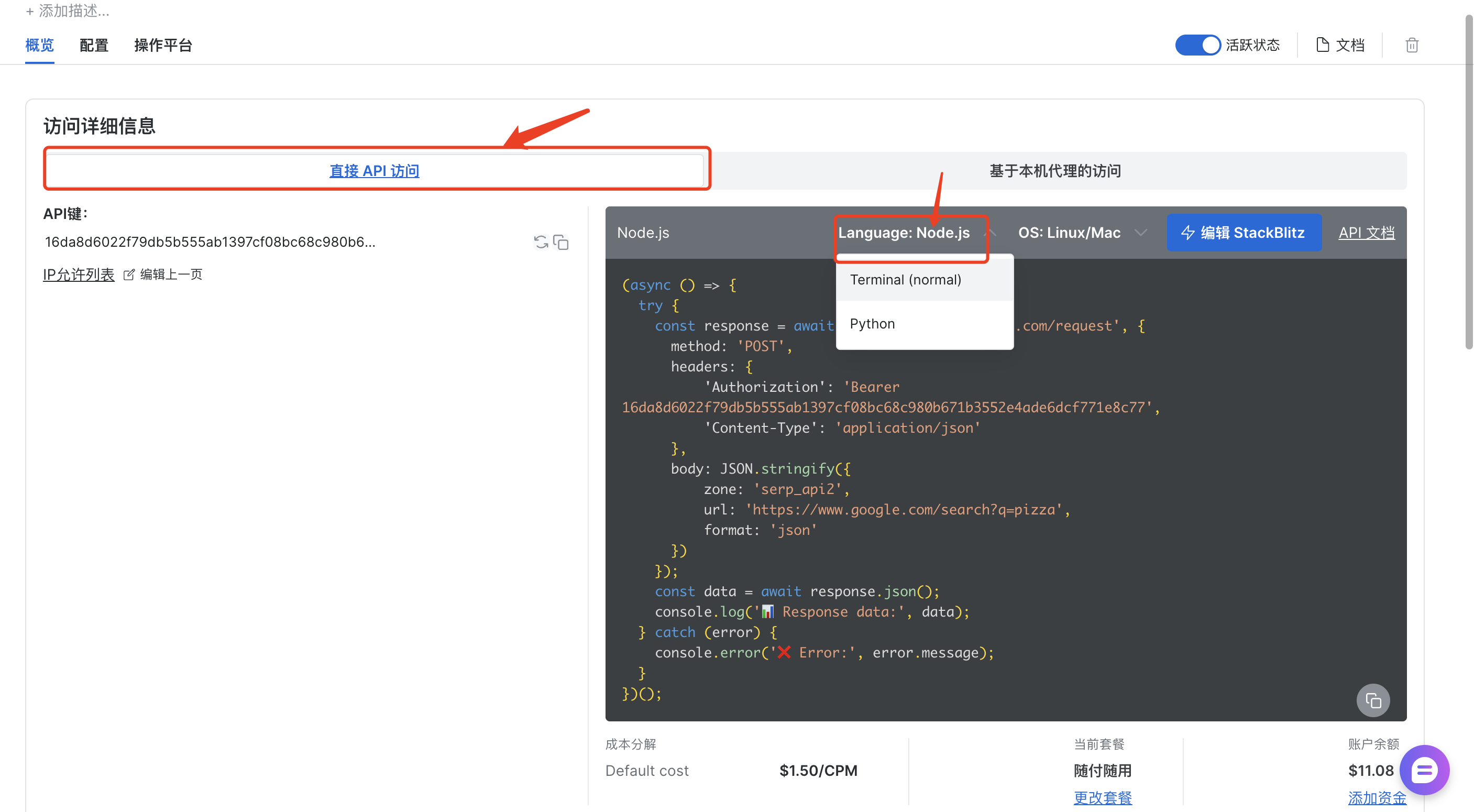 创建完成之后,直接通过 API 访问,这里我选择 NodeJS 语言