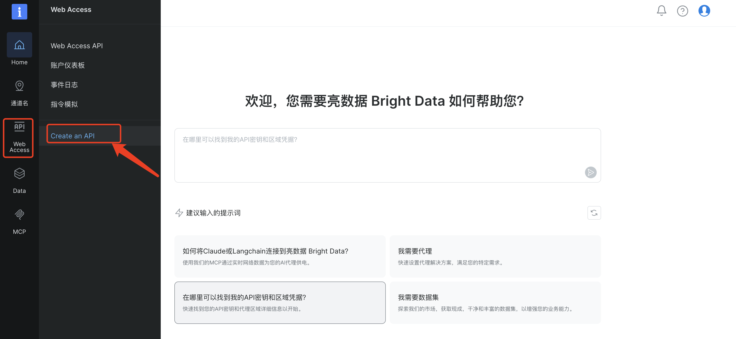首先我们登录到Bright Data 平台之后,选择“Web Access”菜单中的“Create an API”,