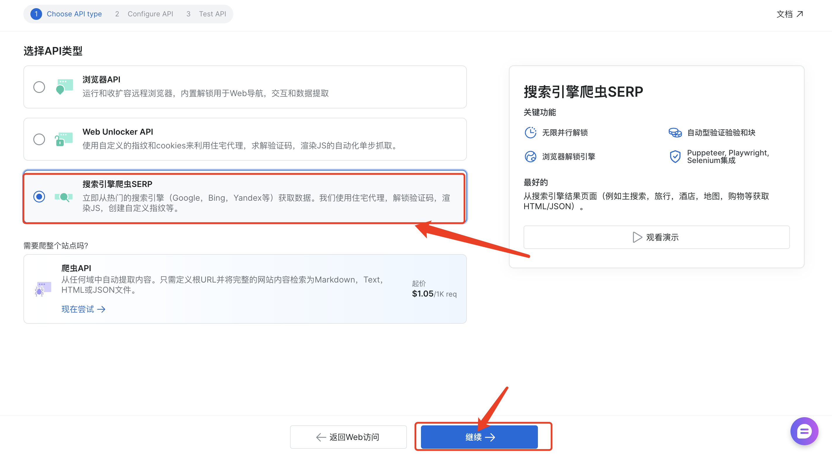 选择 API 类型为“搜索引擎爬虫 SERP”,然后点击“继续”