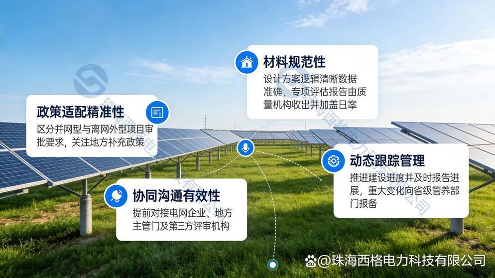 3. 协同沟通有效性:提前与电网企业对接接入可行性,与地方主管部门沟通初审要点,与第三方评审机构衔接评审重点,提升审批效率。