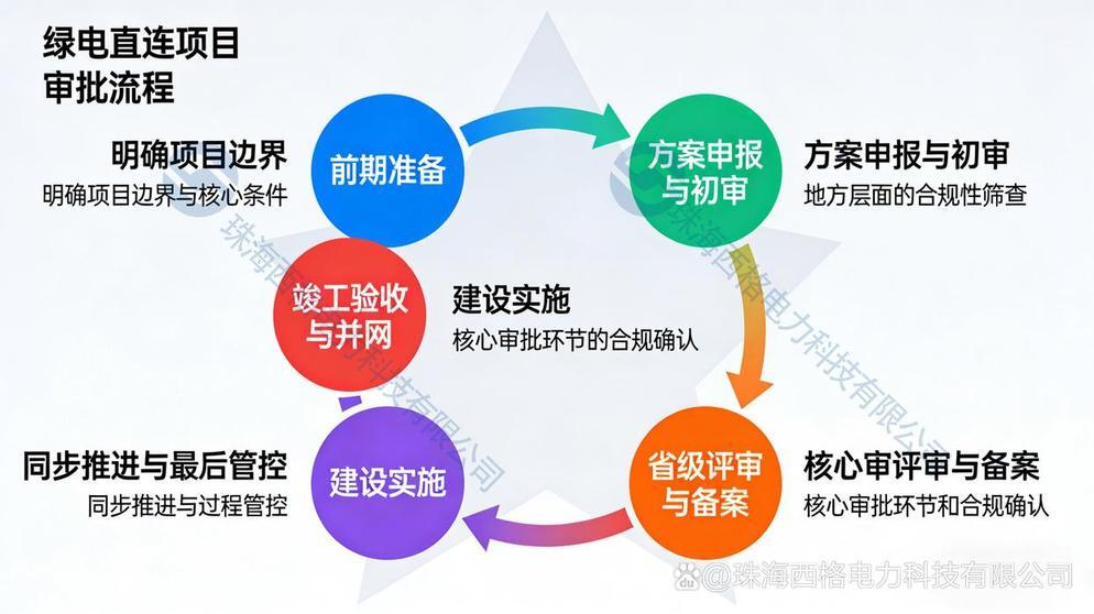 绿电直连项目审批遵循“规划统筹、分级管理、分步实施”的原则,核心流程可分为前期准备、方案申报与初审、省级评审与备案、建设实施、竣工验收与并网五个关键阶段,各阶段环环相扣、权责清晰。