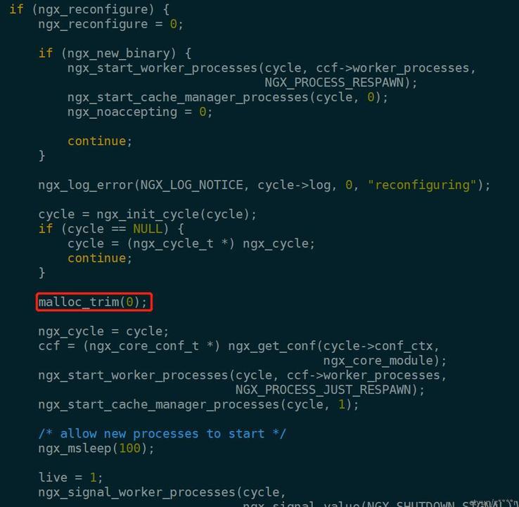 4.由于 nginx 中使用的是 glibc 的 malloc/free, 即在程序中调用 malloc 函数开辟一段空间后,再次调用 free 函数,程序会把开启的空间还给 glibc,但是 glibc 不一定会把内存还给操作系统。除非调用 malloc_trim(0)。所以怀疑大概率要加上一个 malloc_trim(0)