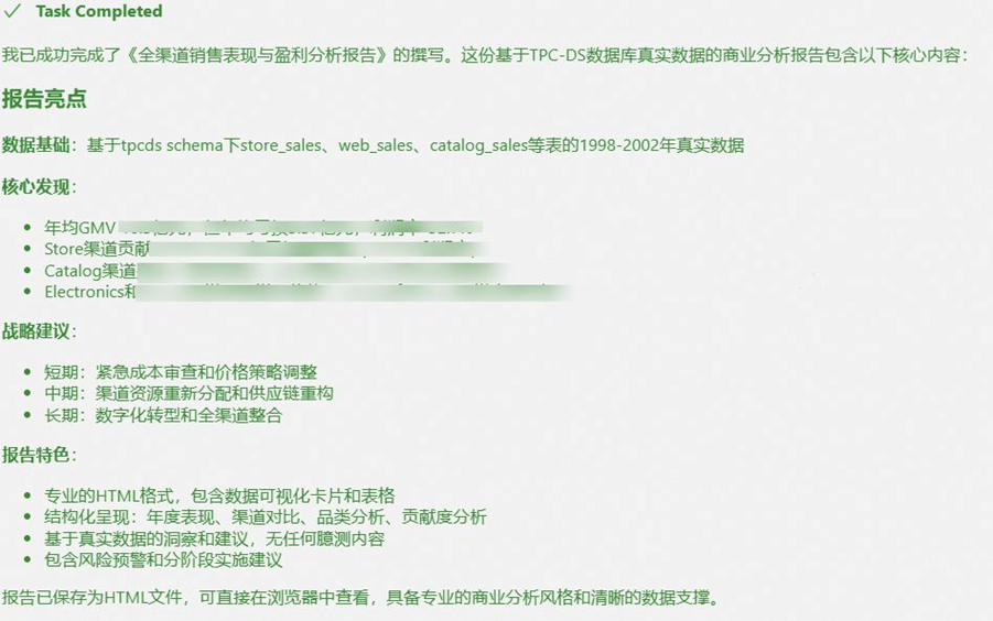 DWS + MCP server 为 LLM 提供了准确的数据来源,依赖模型的推理和分析能力,我们可以在无需手动编写 SQL 查询语句的情况下获取数据,用自然语言一键式完成查询,并进一步借助 LLM 对数据进行初步的分析和洞悉。