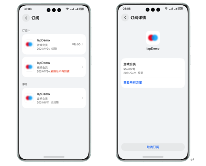 数字商品服务为接入订阅型商品购买能力的应用提供跳转到订阅页或订阅详情页的能力,让用户管理订阅,包括查看订阅、取消订阅、切换订阅、恢复订阅等。