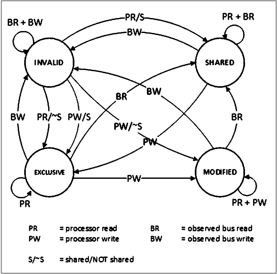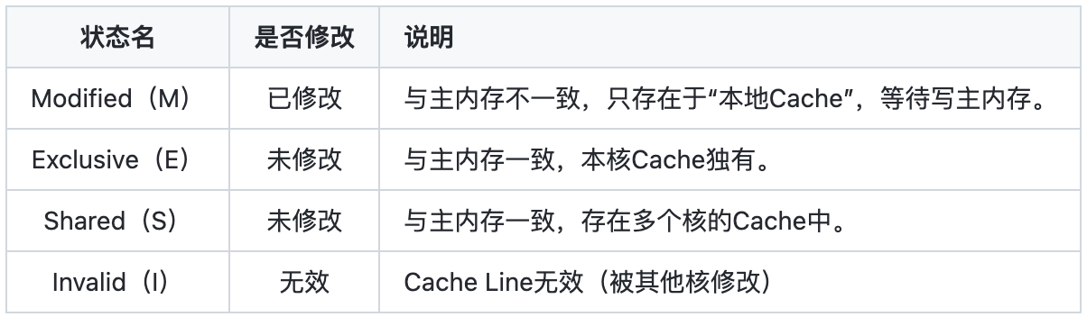 最常见的解决“缓存一致性”的协议,通过“CacheLine 状态跟踪、写传播、事务串行化”,维护一致性。