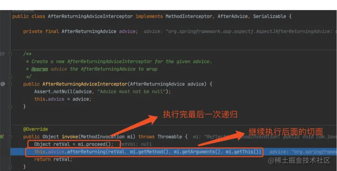 数组的第⼆个对象是 AfterReturningAdviceInterceptor,执⾏ invoke()。