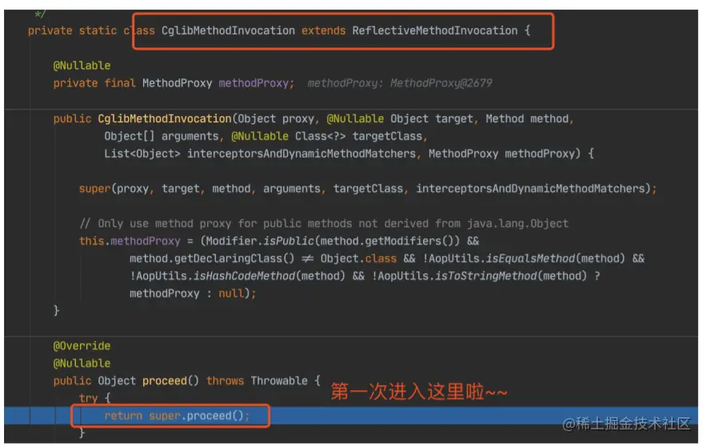 我们的主对象是 CglibMethodInvocation,继承于 ReflectiveMethodInvocation,然后 process() 的核⼼逻辑,其 实都在 ReflectiveMethodInvocation 中。