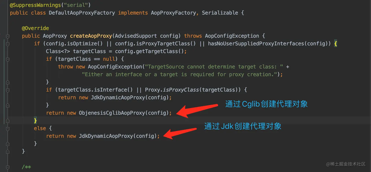 创建 AOP 代理对象:结合 Model 需要进⾏ AOP 的⽅法,选择 Cglib 或 JDK,创建 AOP 代理对象。