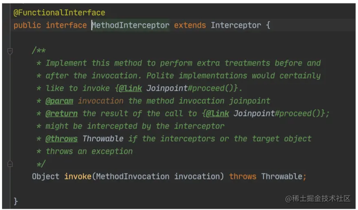 可能有同学会说,invoke() 的⼊参是 MethodInvocation,没错!但是 CglibMethodInvocation 也继承了 MethodInvocation,不信⾃⼰可以去看。