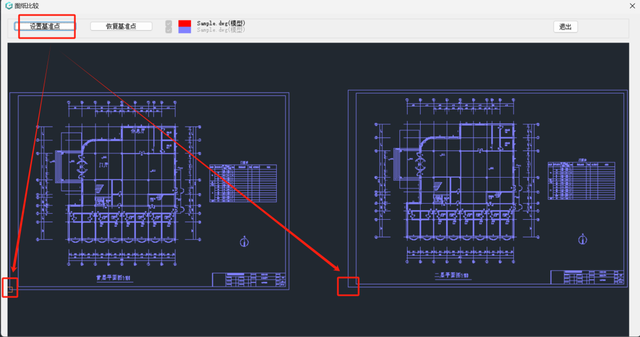 4、进入【图纸比较】后,我们可以点击【设置基准点】,然后用鼠标移动,选择两个平面图的同一基准点,比如图框的同一位置;