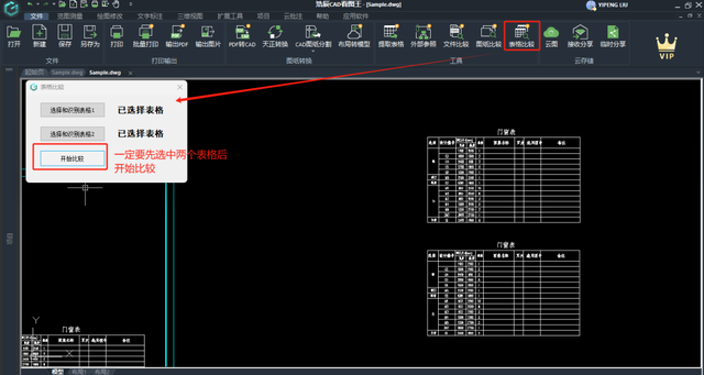 2、点击菜单栏「表格比较」,弹出命令框,按照操作,先框选出第一个表格,再框选出第二个表格;