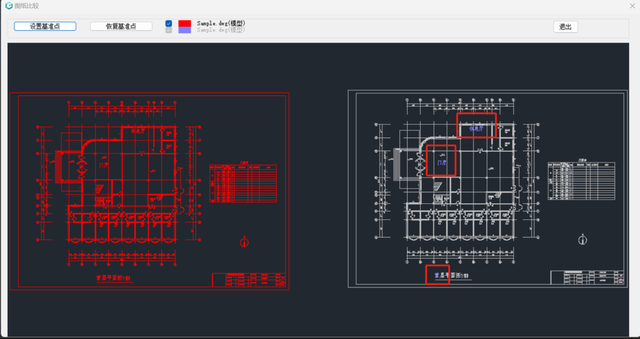 3、框选中两个表格后,点击图纸比较功能,立即可看出两张表格里哪些内容不同,红色框内即为两张表格内的不同内容。
