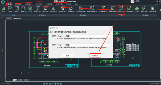 3、点击【图纸比较】后,会出来一个对话框,因为我们需要比较的是同一张图纸中的两个不同的平面图,所以图纸 1 和图纸 2 是一样的,我们只需要点击开始比较就可以啦;