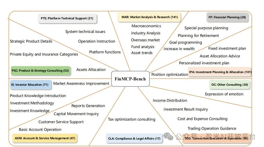 核心场景覆盖:覆盖 10 大主要核心场景(如市场分析、投资规划、投资者教育等)和 33 个子场景,精准还原金融服务的用户画像。